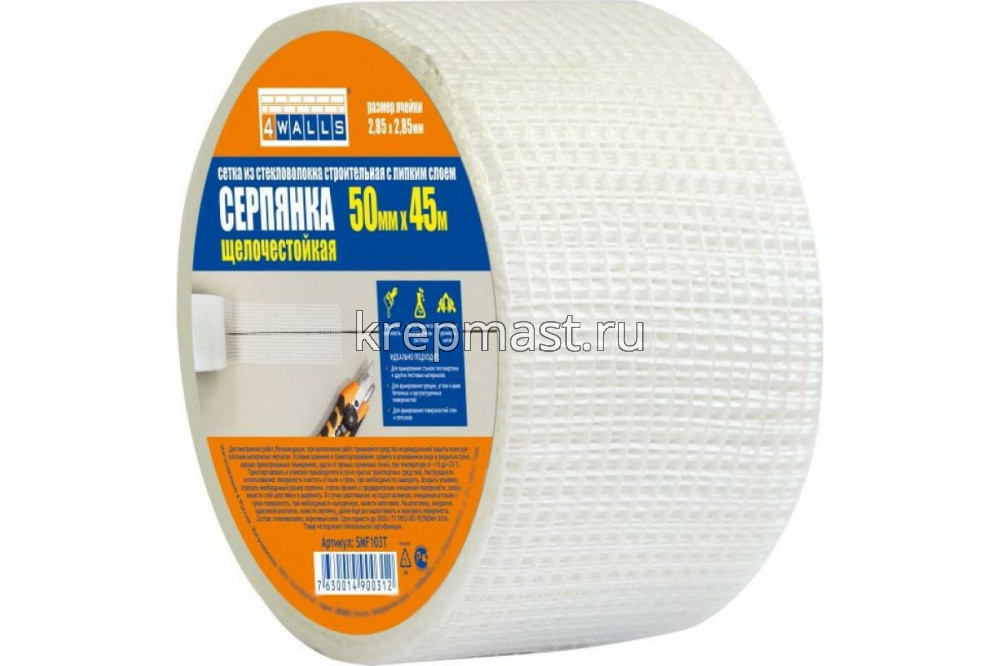 Серпянка щелочестойкая с липким слоем «4WALLS» 50мм х 45м – лента, представляющая собой систему переплетенных стекловолокон. Серпянка имеет сетчатую структуру, что позволяет избегать попадания под ленту воздуха и образования вздутий и неровностей. Сетчатая структура покрыта равномерным слоем клея постоянной липкости, что позволяет качественно, быстро и технологично выполнять работы с ее использованием, даже непрофессионалам.