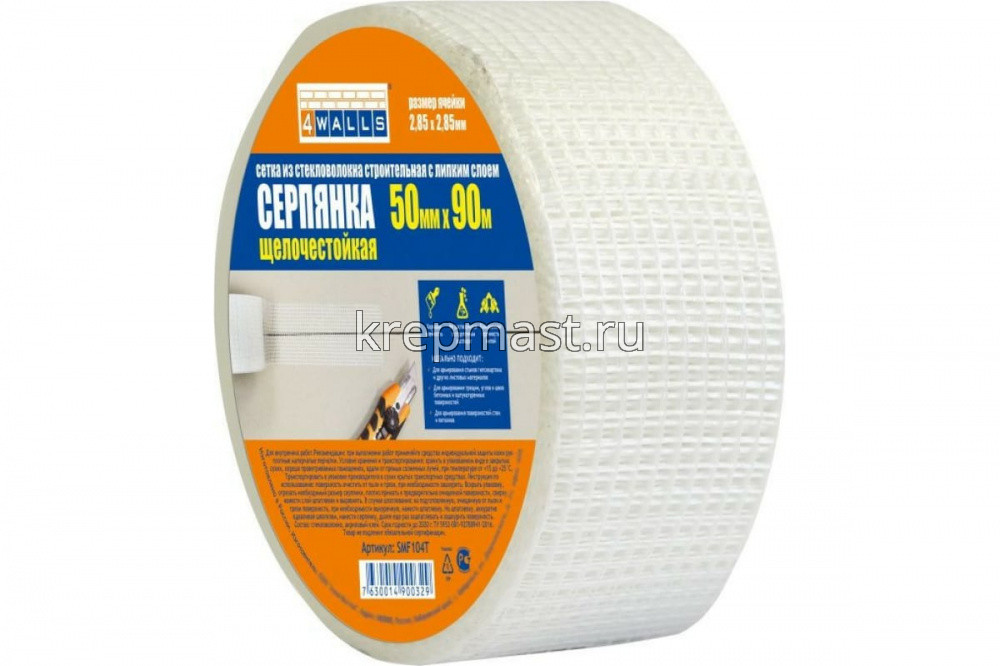 Серпянка щелочестойкая с липким слоем «4WALLS» 50мм х 90м – лента, представляющая собой систему переплетенных стекловолокон. Серпянка имеет сетчатую структуру, что позволяет избегать попадания под ленту воздуха и образования вздутий и неровностей. Сетчатая структура покрыта равномерным слоем клея постоянной липкости, что позволяет качественно, быстро и технологично выполнять работы с ее использованием, даже непрофессионалам.