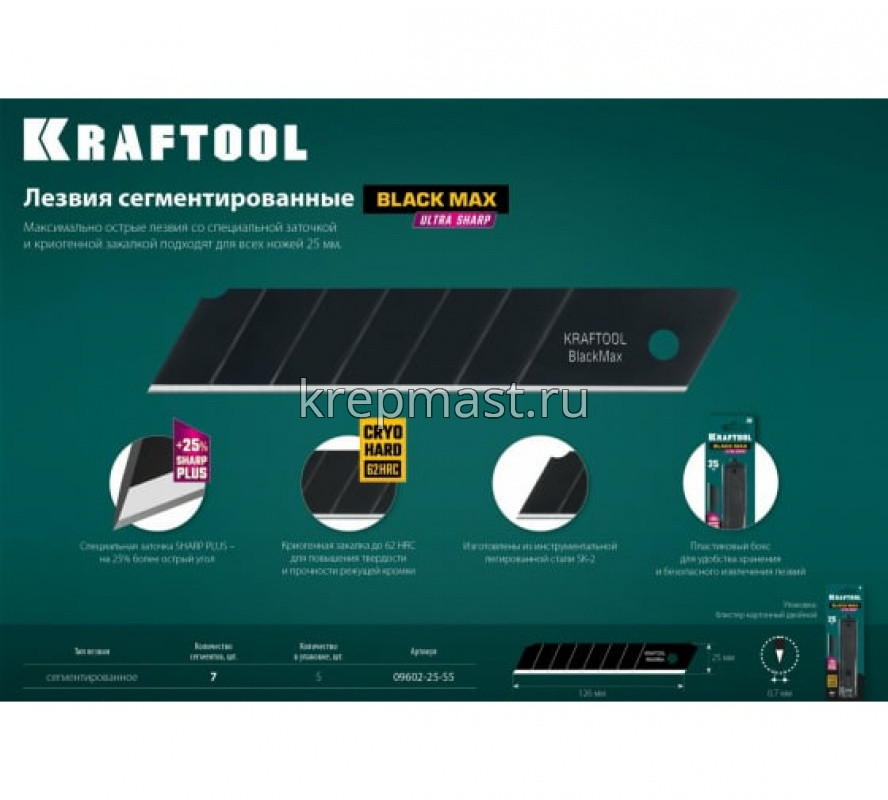 Сегментированные лезвия KRAFTOOL 25 мм, 5 шт 09602-25-S5 имеют специальную заточку и криогенную закалку. Изготовлены из инструментальной легированной стали SK-2. Двугранная заточка SHARP PLUS обеспечивает особо острую режущую кромку.