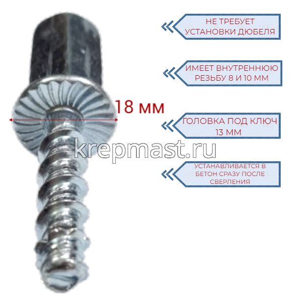 Анкер - шуруп PMB по бетону 6 х 35 (вн.диам.м8/10мм) - готов к закручиванию в основаиие сразу после засверливания и не требует установки дюбеля. Шестигранная головка имеет внутреннюю соосную резыбу двух диаметров М8 и М10 для креплления метрческой шпильки.