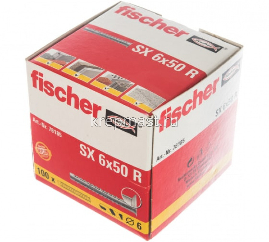 Распорный дюбель FISCHER SX 6x50 Rприменяется для создания надежных и долговременных креплений, в дальнейшем используемых для подвешивания или фиксации светильников, стенных шкафов, гардеробов, почтовых ящиков, кронштейнов для телевизоров, складных ставней, поручней, световых шахт, а так же для монтажа ванн и унитазов.