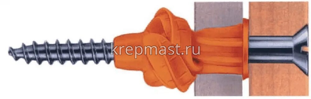 При попадании в полость дюбель наворачивается на шуруп и завязывается в плотный узел, который надёжно крепит шуруп в стене.