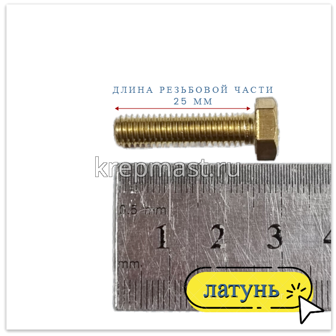 Болт 6х25 DIN 933 латунь в интернет-магазине «Мастер Крепежа» по цене 53 руб. Более 26 наименований товаров в наличии в категории Болты латунные DIN 933. Купить болт 6х25 din 933 латунь в Набережных Челнах выгодно Вы можете on-line на нашем сайте, или отправив заявку по почте, а также по телефону или в пункте выдачи компании г. Казань, ул. Татарстан, 9, магазин "Мастер Крепежа". Доставка по Республике Татарстан и другие регионы РФ.