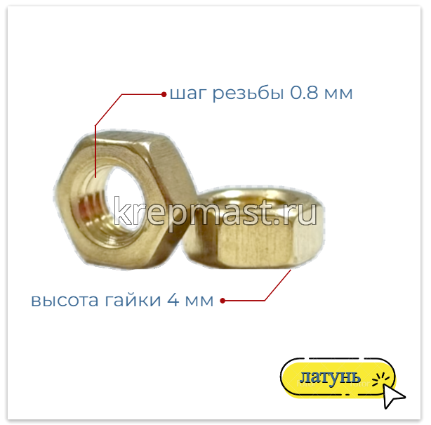 Гайка 6-гр. М 5 (0,8) латунь DIN 934 в интернет-магазине «Мастер Крепежа» по цене 16 руб. Более 7 наименований товаров в наличии в категории Гайки латунные DIN 934 (ГОСТ 5927) . Купить гайка 6-гр. м 5 (0,8) латунь din 934 в Набережных Челнах выгодно Вы можете on-line на нашем сайте, или отправив заявку по почте, а также по телефону или в пункте выдачи компании г. Казань, ул. Татарстан, 9, магазин "Мастер Крепежа". Доставка по Республике Татарстан и другие регионы РФ.
