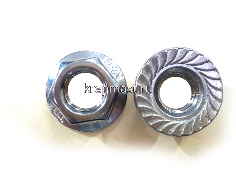 Нержавеющая гайка с фланцем М 10 DIN 6923 А2 крепежный элемент, совмещающий в себе шестигранную гайку с одной стороны и фланец (плоскую деталь круглой формы) — с другой. Другие названия этого метиза — гайка фланцевая, самостопорящаяся, с прессшайбой. Крепление производится с помощью гаечного ключа.