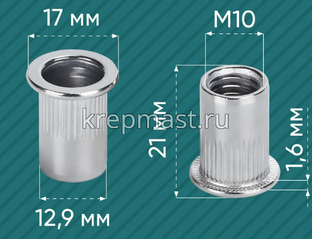 Заклепка резьбовая нержавеющая M10х21 используется для соединения листовых материалов или отдельных деталей изделий в тех случаях, когда созданный крепежный узел должен быть скрытым.