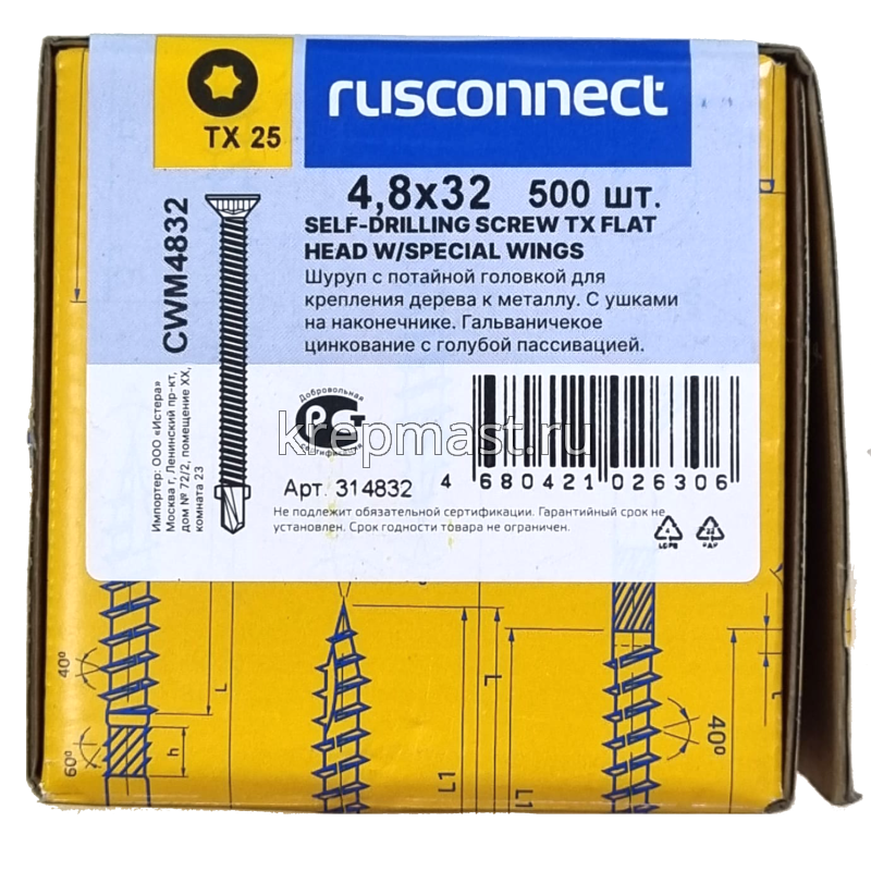 Саморез кровельный ТХ20 с ушками без шайбы DIN 7504 P 4,8х32 потай. - сверло оцинк. Rusconnect применяется для крепления деревянной доски к металлической обрешетке. На острие самореза находится бур с двумя выступающими "ушками", которые свободно проходят через древесину и обламываются, когда саморез достигает металла. На нижней стороне потайной головки есть несколько выступов предназначенных для самозенковки и аккуратного утапливания заподлицо с поверхностью. Помимо досок данными саморезами можно крепить фанеру, ДСП и плиты МДФ.