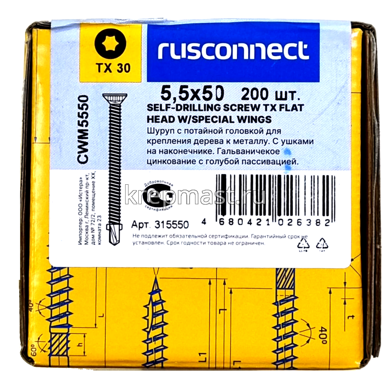 Саморез кровельный ТХ20 с ушками без шайбы DIN 7504 P 5,5х50 потай. - сверло оцинк. Rusconnect применяется для крепления деревянной доски к металлической обрешетке. На острие самореза находится бур с двумя выступающими "ушками", которые свободно проходят через древесину и обламываются, когда саморез достигает металла. На нижней стороне потайной головки есть несколько выступов предназначенных для самозенковки и аккуратного утапливания заподлицо с поверхностью. Помимо досок данными саморезами можно крепить фанеру, ДСП и плиты МДФ.