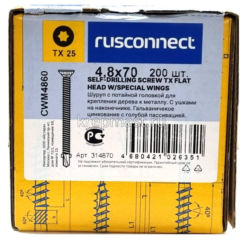 Саморез кровельный ТХ25 с ушками без шайбы DIN 7504 P 4,8х70 потай. - сверло оцинк. Rusconnect применяется для крепления деревянной доски к металлической обрешетке. На острие самореза находится бур с двумя выступающими "ушками", которые свободно проходят через древесину и обламываются, когда саморез достигает металла. На нижней стороне потайной головки есть несколько выступов предназначенных для самозенковки и аккуратного утапливания заподлицо с поверхностью. Помимо досок данными саморезами можно крепить фанеру, ДСП и плиты МДФ.
