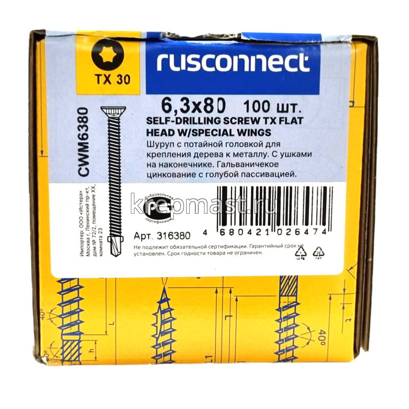 Саморез кровельный ТХ30 с ушками без шайбы DIN 7504 P 6,3х80 потай. - сверло оцинк. Rusconnect применяется для крепления деревянной доски к металлической обрешетке. На острие самореза находится бур с двумя выступающими "ушками", которые свободно проходят через древесину и обламываются, когда саморез достигает металла. На нижней стороне потайной головки есть несколько выступов предназначенных для самозенковки и аккуратного утапливания заподлицо с поверхностью. Помимо досок данными саморезами можно крепить фанеру, ДСП и плиты МДФ.