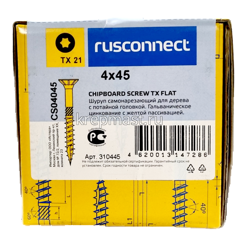 Шуруп с/нарез. для дерева потай 4,0х 45 Тх в интернет-магазине «Мастер Крепежа» по цене 8 руб. Более 43 наименований товаров в наличии в категории Шурупы КОНСТРУКЦИОННЫЕ для дерева. Купить шуруп с/нарез. для дерева потай 4,0х 45 тх в Набережных Челнах выгодно Вы можете on-line на нашем сайте, или отправив заявку по почте, а также по телефону или в пункте выдачи компании г. Казань, ул. Татарстан, 9, магазин "Мастер Крепежа". Доставка по Республике Татарстан и другие регионы РФ.