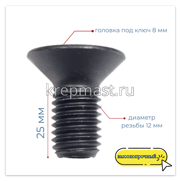 Винт с потайной головкой и внутренним шестигранником DIN 7991 М 12 х 25 класс прочности 10,9 без покрытия применяется для крепления в зенкованное отверстие с метрической резьбой в любые металлы и твердые пластмассы.