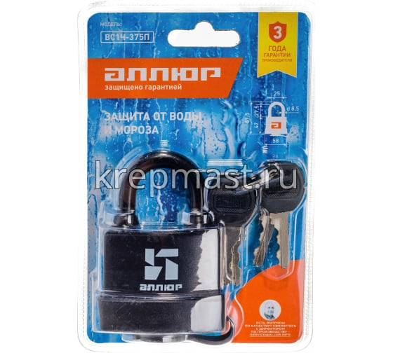 Замок навесной АЛЛЮР ВС1Ч-375П d.8,5мм водостойкий в интернет-магазине «Мастер Крепежа» по цене 646 руб. Более 10 наименований товаров в наличии в категории Замок водостойкий. Купить замок навесной аллюр вс1ч-375п d.8,5мм водостойкий в Набережных Челнах выгодно Вы можете on-line на нашем сайте, или отправив заявку по почте, а также по телефону или в пункте выдачи компании г. Казань, ул. Татарстан, 9, магазин "Мастер Крепежа". Доставка по Республике Татарстан и другие регионы РФ.