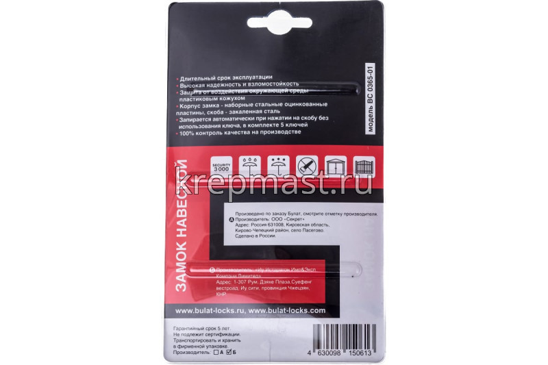 Замок навесной БУЛАТ ВС 0365-01 водостойкий в интернет-магазине «Мастер Крепежа» по цене 1283 руб. Более 10 наименований товаров в наличии в категории Замок водостойкий. Купить замок навесной булат вс 0365-01 водостойкий в Набережных Челнах выгодно Вы можете on-line на нашем сайте, или отправив заявку по почте, а также по телефону или в пункте выдачи компании г. Казань, ул. Татарстан, 9, магазин "Мастер Крепежа". Доставка по Республике Татарстан и другие регионы РФ.