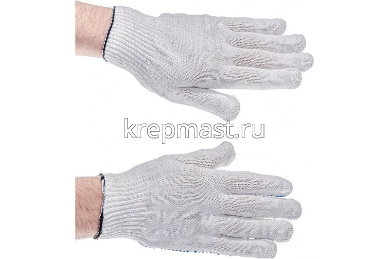 пятинитиевые перчатки выполнены из натуральной ткани. Точечное ПВХ покрытие на трехнитках на ладони препятствует выскальзыванию предметов из рук.